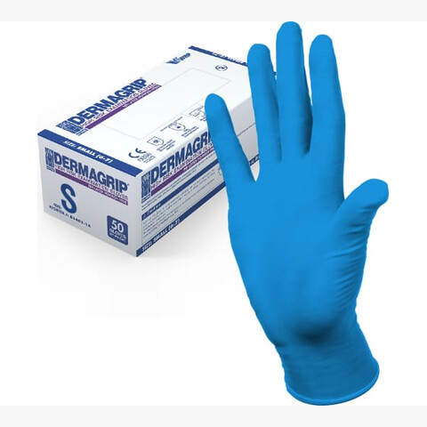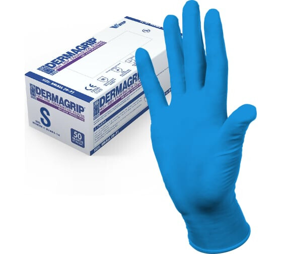 Перчатки латексные Dermagrip, синие -S, смотровые нестерильные, неопудренные 1 пара(10*25)