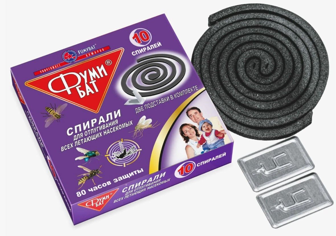 Спирали ФУМИБАТ предназначены для отпугивания насекомых (комаров, мошек, москитов) на открытой местности или в хорошо проветриваемых помещениях (веранды, беседки). Главный плюс такого способа борьбы с вредителями – автономность. Для эксплуатации не нужна розетка или батарейки, поэтому средство удобно брать с собой за город.