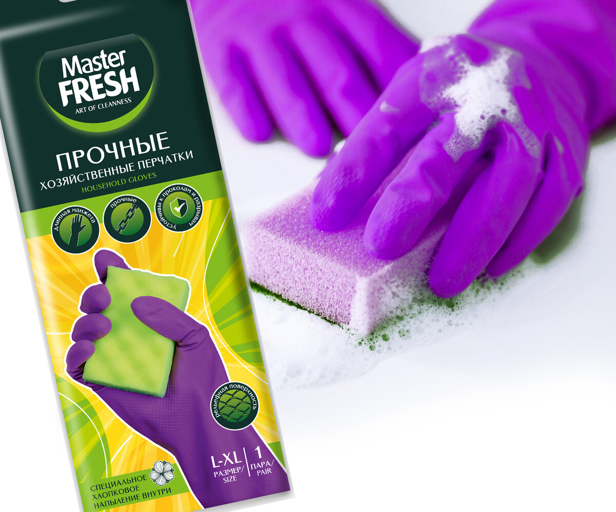 • Хозяйственные перчатки Master FRESH обеспечивают максимальный комфорт во время работы - их легко снимать и надевать. Изготовлены из прочного латекса с рифленой поверхностью, которая позволяет удерживать мокрые предметы, а хлопковое напыление препятствует прилипанию перчаток к коже рук. Длинная манжета предотвращает попадание воды внутрь перчатки. Перчатки эффективно защищают руки от загрязнений, воздействия моющих и чистящих средств. Подходят для различных видов домашних работ (мытье посуды, уборка дома, садоводство, стирка белья, мытье окон, ремонтные работы, мытье машины, работа в пыльных помещениях).