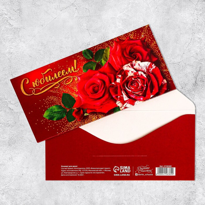 Конверт для денег «С юбилеем!», красные розы, 16.5 х 8 см