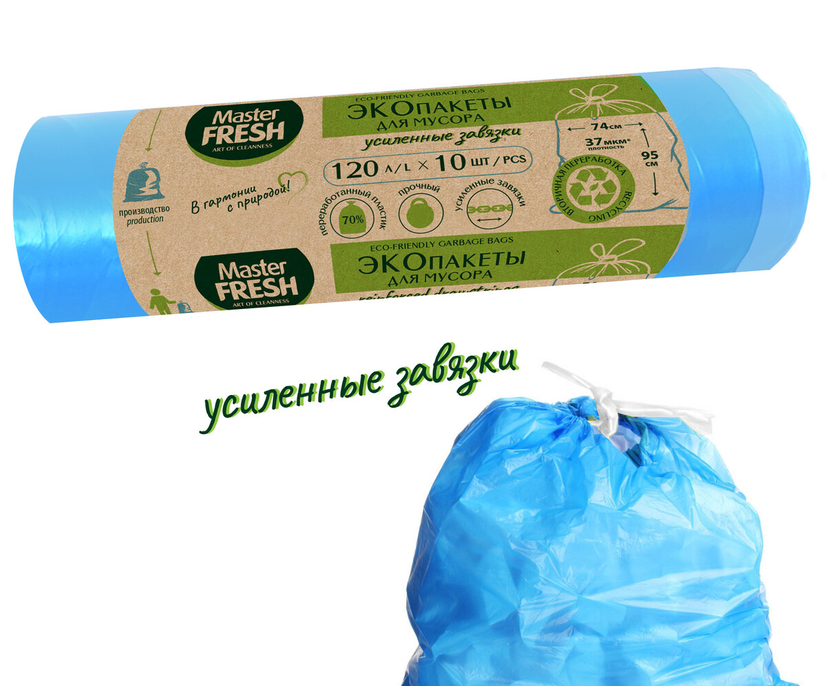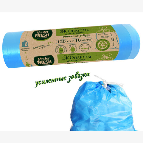 Прочные ЭКО пакеты для мусора Master Fresh на 70% производятся из вторичного переработанного сырья. Подлежат последующей переработке. Таким образом, сокращается вред, наносимый окружающей среде. Повышенная плотность ЭКО пакетов Master Fresh позволяет выдерживать нагрузку до 30 кг! Практичные и удобные в применении ЭКО пакеты мягкие на ощупь, из всей линейки пакетов для мусора их выделяет небесно-голубой цвет. Оптимальный размер пакетов идеально подходит для ведра объемом 50 л.