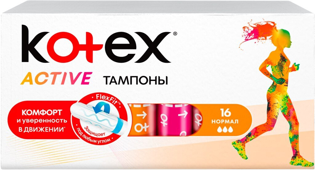Тампоны Active НОРМАЛ – это больше чем просто защита. Благодаря дополнительным разнонаправленным желобкам и голубой линии защиты новые тампоны Kotex Active быстро впитывают жидкость и защищают под любым углом и обеспечивают комфорт в движении и уверенность на все 100! Основные преимущества: • Вдвое больше желобков • Тонкий кончик и шелковистое покрытие «Silky Cover» • Специальная голубая зона из гидрофильных волокон ULTRA SORB • Двигаются вместе с тобой и защищают под любым углом благодаря технологии Flex fit • Голубая линия защиты от протекания. В упаковке-16 тампонов.