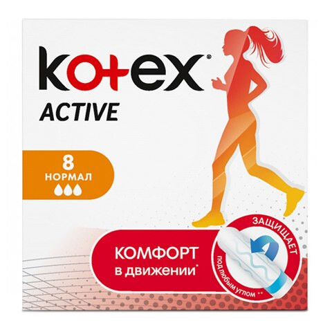 Тампоны Active НОРМАЛ – это больше чем просто защита. Благодаря дополнительным разнонаправленным желобкам и голубой линии защиты новые тампоны Kotex Active быстро впитывают жидкость и защищают под любым углом и обеспечивают комфорт в движении и уверенность на все 100! Основные преимущества: • Вдвое больше желобков • Тонкий кончик и шелковистое покрытие «Silky Cover» • Специальная голубая зона из гидрофильных волокон ULTRA SORB • Двигаются вместе с тобой и защищают под любым углом благодаря технологии Flex fit • Голубая линия защиты от протекания. В упаковке-8 тампонов.