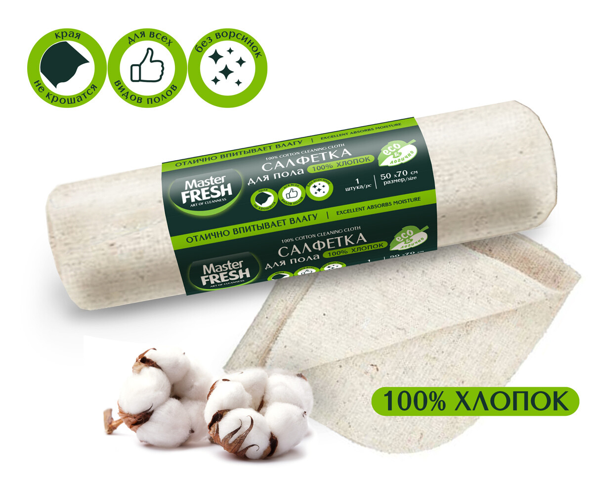 Салфетка для уборки пола Master FRESH изготовлена из 100% высококачественного хлопка. Размер 50*70 см Хлопок - полностью натуральный и экологически безопасный материал, не вызывающий аллергию. Ультрамягкая; износостойкая; превосходно впитывает влагу и быстро сохнет; легко отжимается; не оставляет после себя мусора, волокон; может применяться с бытовыми моющими средствами, в том числе и с хлором; можно стирать в стиральной машине при t не выше 30°С; рекомендуем использовать совместно со шваброй Master FRESH, достаточно лишь обернуть платформу салфеткой и продеть края в специальные отверстия на платформе; при использовании допускается наличие желтого цвета на салфетке, это полностью доказывает натуральность сырья из которого изготовлена салфетка, данный цвет никак не влияет на эксплуатационные свойства салфетки.